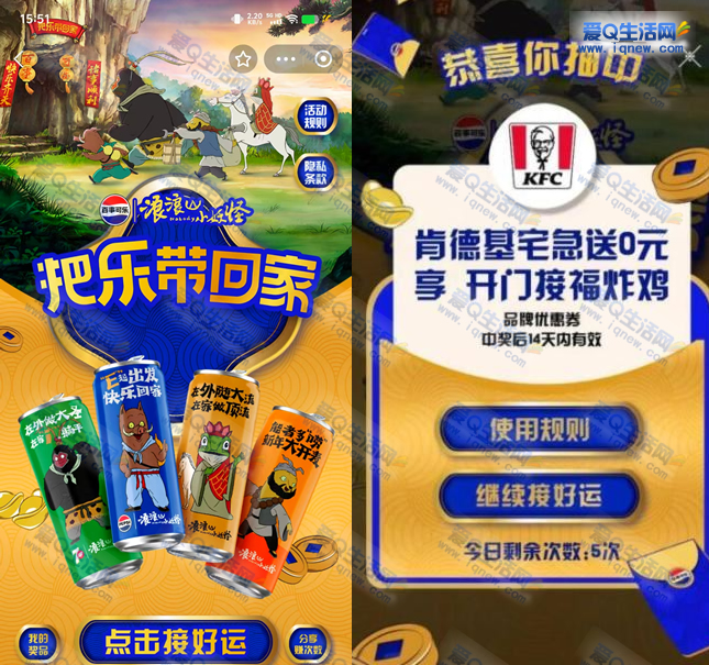 百事可乐抽肯德基0元炸鸡桶 随单使用