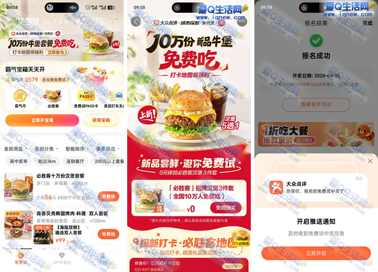 大众点评app搜【免费试】顶部横幅【0元吃喝玩乐】-先点击【立即开宝箱】领一次机会开宝箱-然后点击顶部横幅【10万份牛堡套餐免费吃】点进去 下拉点击免费抽奖 等4月4日开奖即可