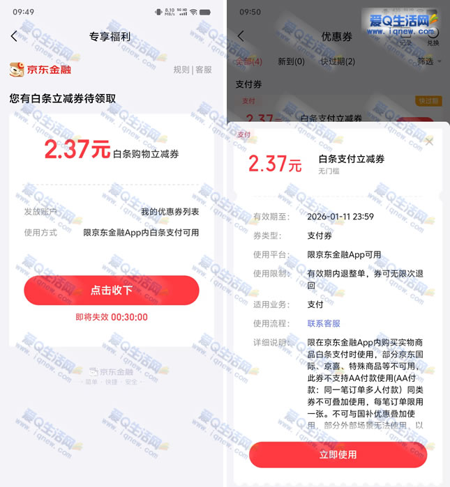 京东金融领2.37元白条支付立减券 当日有效 ...