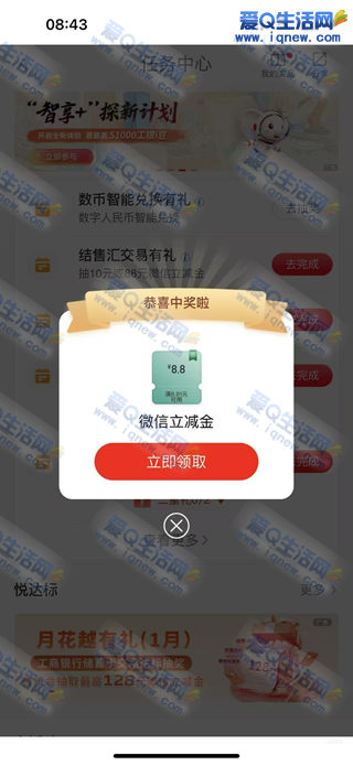 有这个任务的可以参与试试,反馈是抽到了8.8元立减金