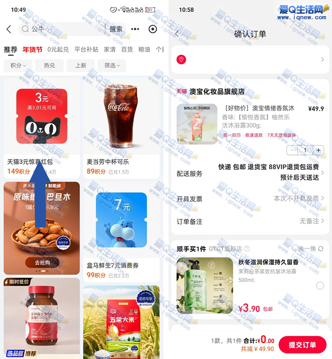 可以了兑换3元天猫无门槛红包,可以最低4.9元撸沐浴露