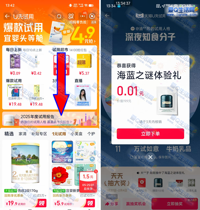 淘宝APP搜【u先试用】-中间横幅【2025年度试用报告】-进去查看抽奖
