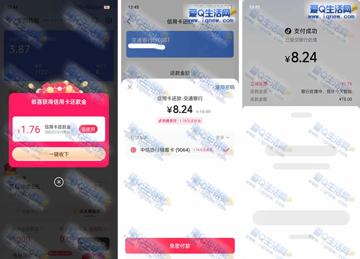 抖音免费领信用卡还款金 亲测1.76元秒到