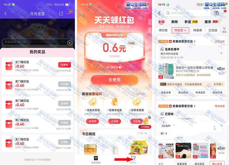 3.京东金融APP-首页【天天红包】-点进去抽鸿苞-右下角【购物车】最后支付抵扣红包 0.01元到手