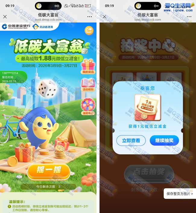 建行劳动者港湾抽奖 亲测1元微信立减金 ...