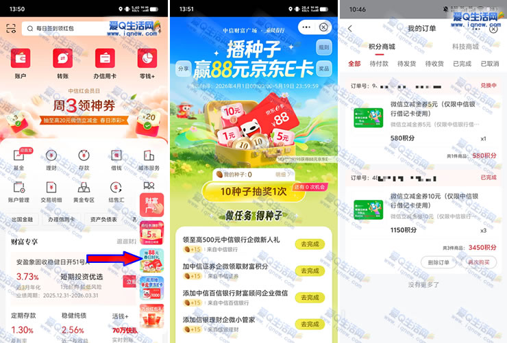 中信APP-右侧悬浮【财富广场】-【春日好礼】-下拉任务得积分,10积分抽一次