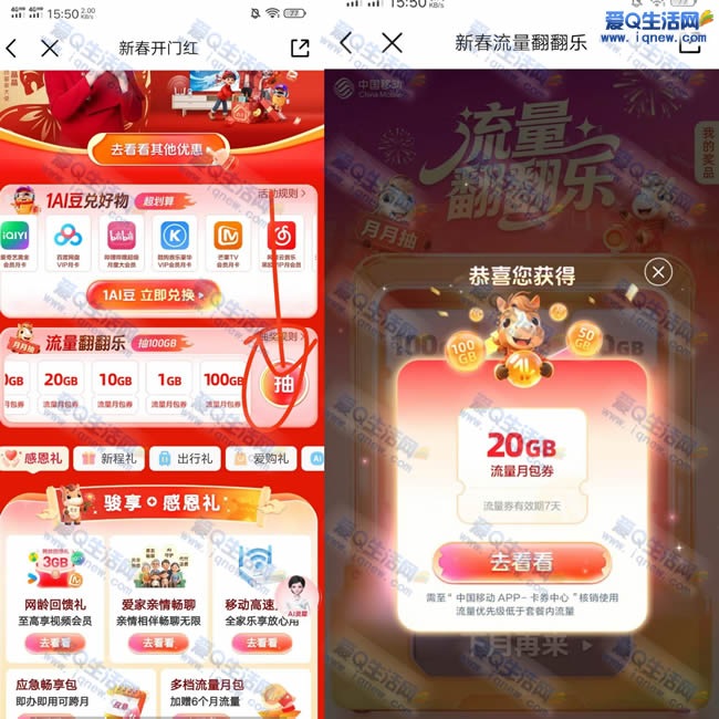 中国移动APP搜索【流量翻翻乐】-下拉抽1~100G流量月包
