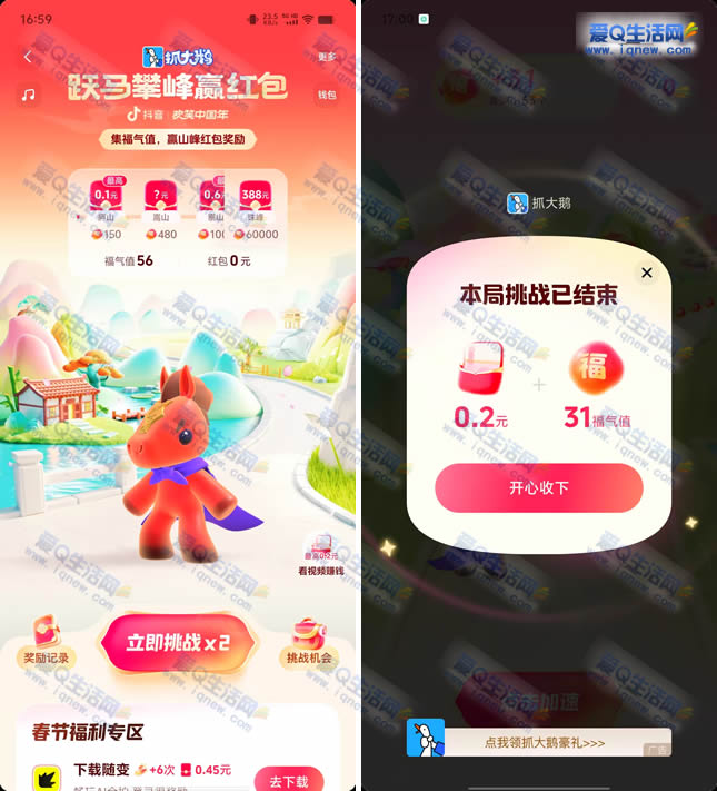 抖音APP扫码-任务领取挑战机会-去挑战得福气值-福气值接锁山峰红包
