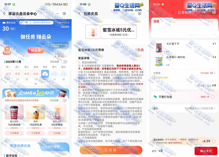 移动云盘1云朵 抢霸王茶姬/喜茶/蜜雪兔单券 ...