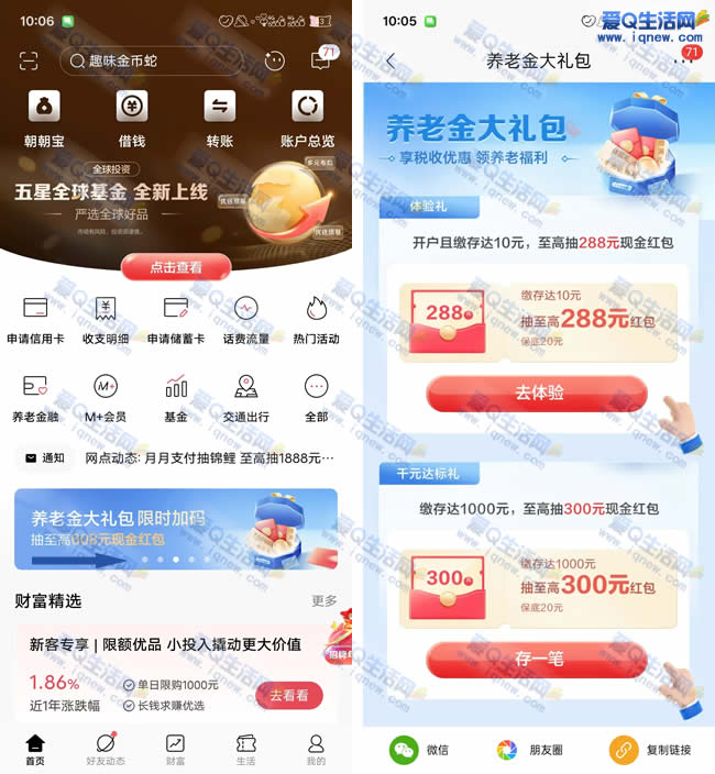 招行APP-首页中间滚动横幅【养老金大礼包 限时加码】点击进去 开通养老金 抽现金红包