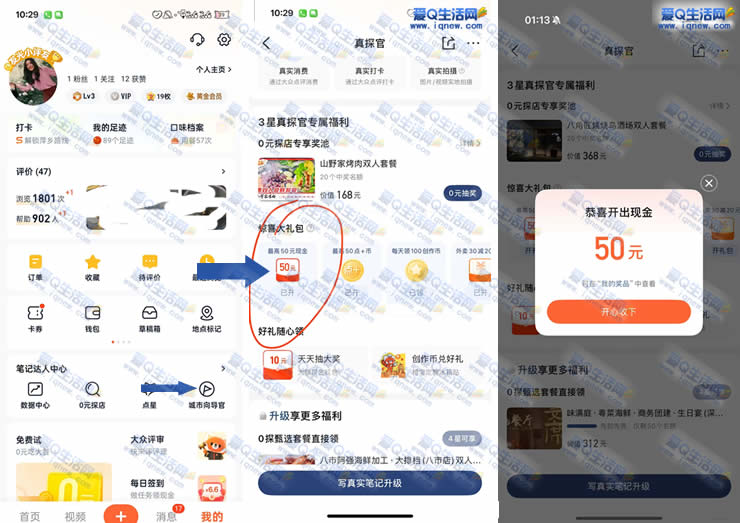 大众点评APP-下拉至【笔记达人中心】-城市想到光-查看【真探官福利】底部【写真实笔记 参与真探官评星】抽最高50元现金