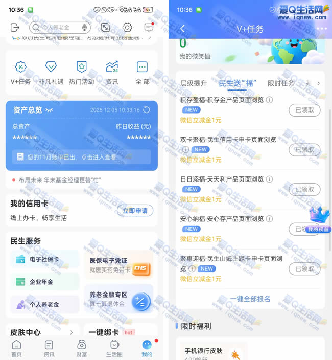 民生银行-我的+顶部【v+任务】+下拉选择【民生送福】去完成任务有立减金