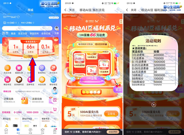 1AI豆可参与抽奖一次,抽最高66元话费,非必中