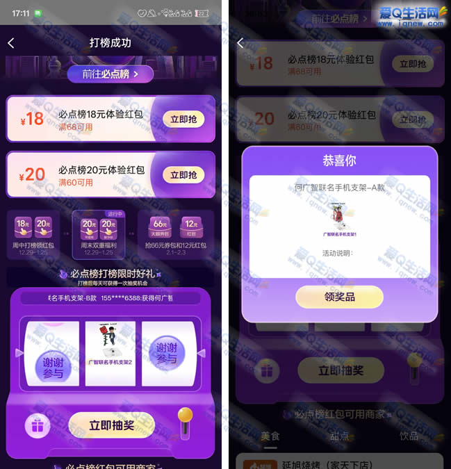 美团必点榜抽实物 亲测中手机支架1个