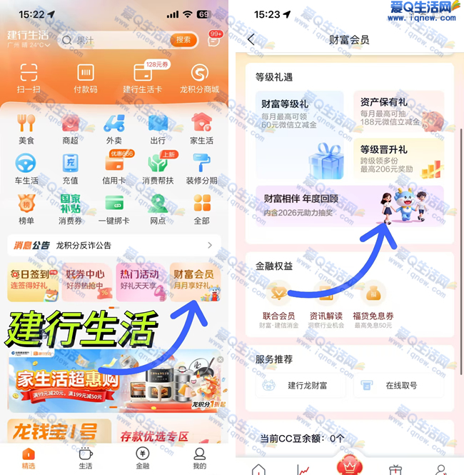 1.建行生活APP-首页【财富会员】-下拉至【等级礼遇】-【财富相伴 年度回顾】点进去