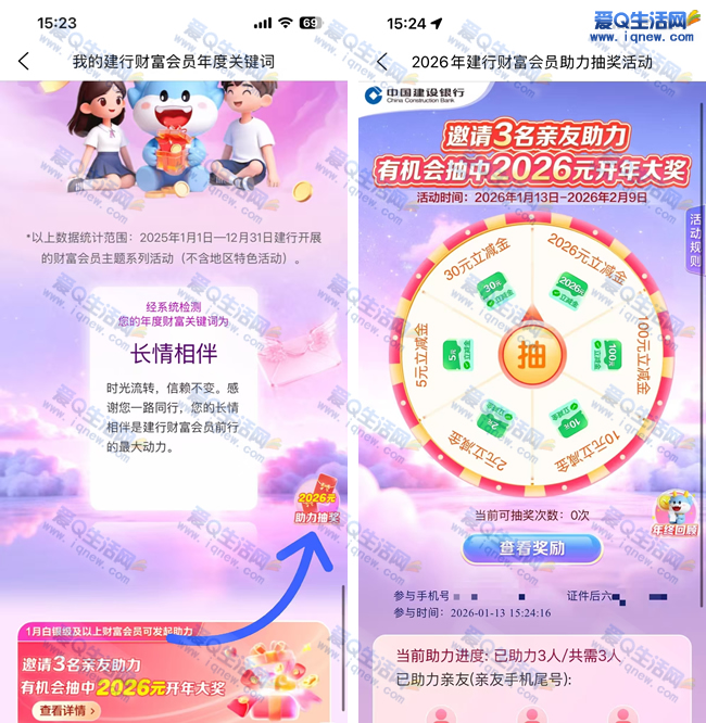 2.完成回顾之后-右侧悬浮窗口【2026元助力抽奖】点进去 邀请三个好友 助力 可以参与抽立减金