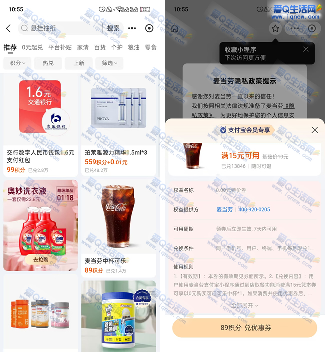 支付宝积分兑换麦当劳可乐 随单15元使用 ...