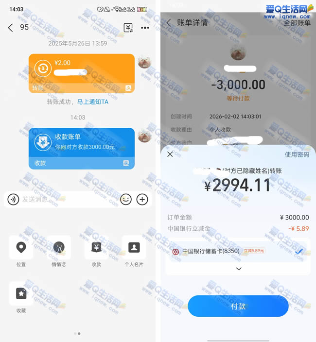 支付宝APP-收款3000-打款方支付3000元 用中行付款 部分号会显示6元立减 可以有3次立减机会