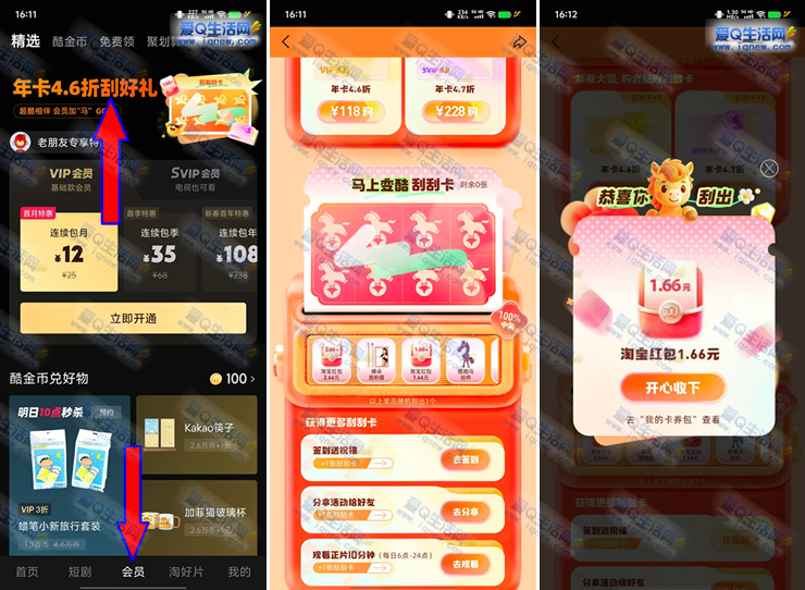 优酷APP-底部【会员】-顶部【精选】-【年卡4.6折刮好礼】-下拉任务刮奖