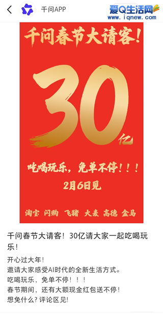 千问APP-2月6日开始有瓜分30亿元免单活动