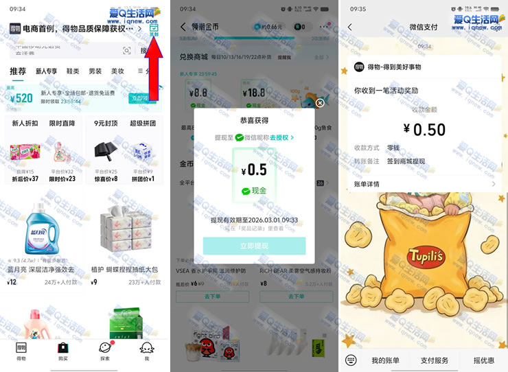 亲测0.5元秒到 得物签到金币兑换0.5-58元现金 ...