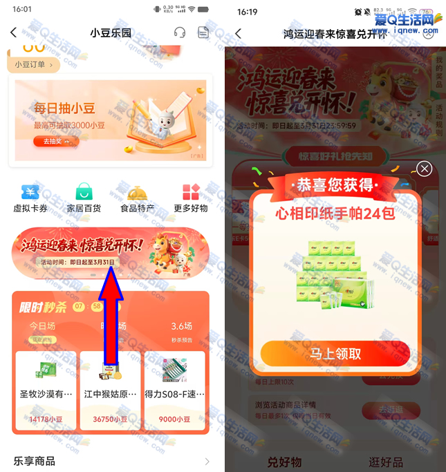 农行APP-首页【小豆乐园】中间滚动横幅【鸿运迎春来 惊喜兑开怀】点击进去下拉完成任务获得抽奖试试
