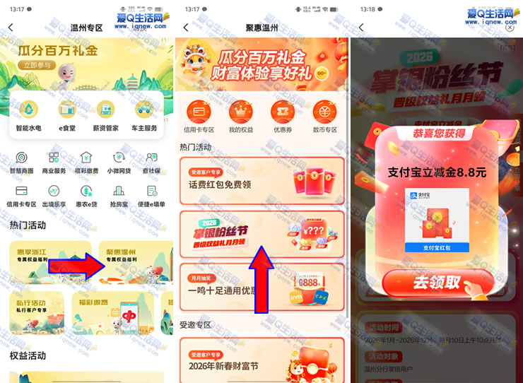 农行APP-城市专区-左上角选【温州】-下拉热门活动【聚惠温州】-【掌银粉丝节】-抽取奖励
