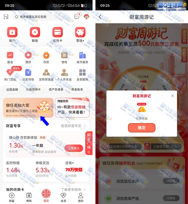 中信APP-中间右侧滚动横幅【做任务抽大奖 赢至高500元微信立减金】点进去 完成任务抽立减金试试