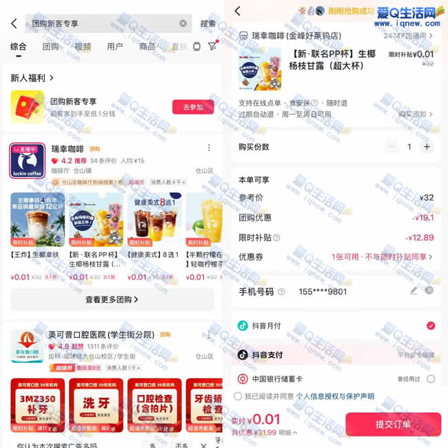 抖音APP搜索:【团购新客限时专享】-30天未在抖音下过团购单的有0.01瑞幸和0.01蜜雪可以外卖配送