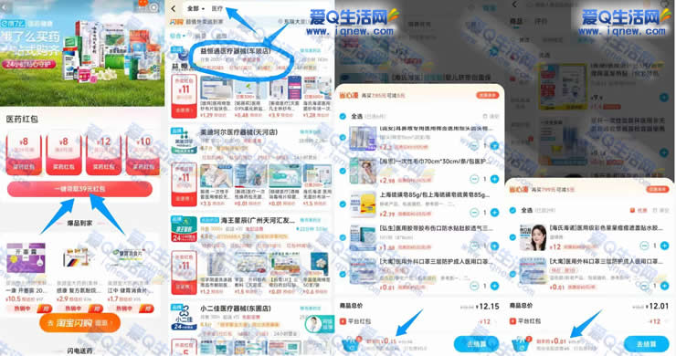 1.一键领取红包 含12-12元医药红包,不显示顶部右侧 切换地址到上海