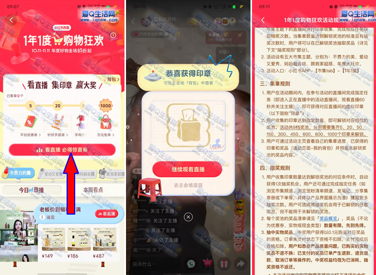 小红书APP搜【1年1度购物狂欢】-进去参与-点击【看直播 必得惊喜券】-每个直播间看60秒关注后领取印章-印章累计解锁奖池去抽实物
