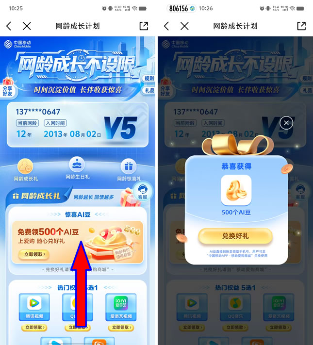 亲测5元话费秒到 移动网龄礼领AI豆兑换5-20元话费