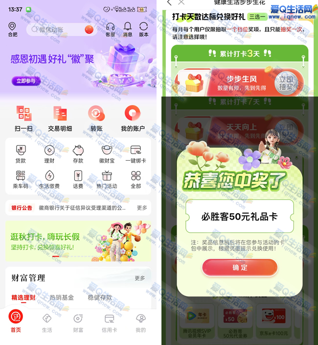 微商银行APP-中间滚动横幅【逛秋打卡 嗨玩长假】点进去 打开抽奖 打卡3天 7天 12天都可以抽奖