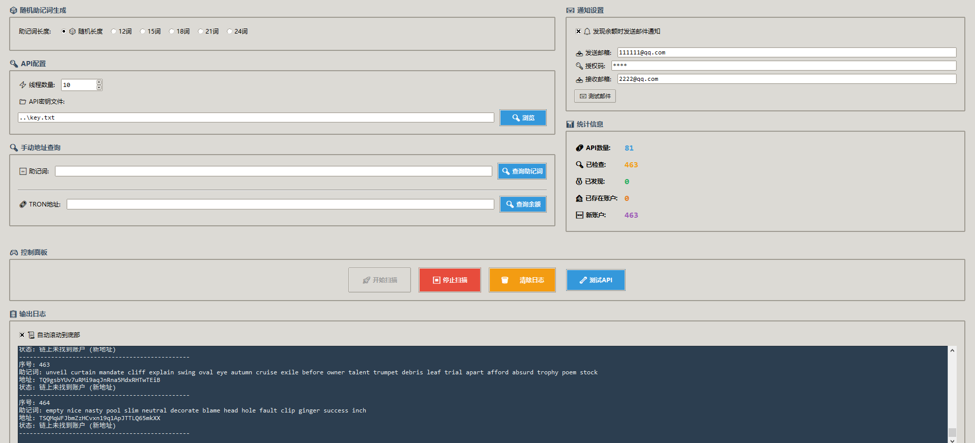 1.程序随机生成助记词并查询余额,查询到大于0的余额自动发送qq邮箱通知。