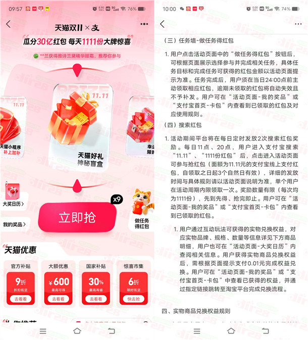 支付宝双11瓜分30亿红包 每天11点、20点整抢11.11元支付宝红包