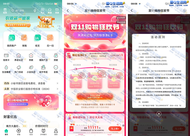 农行签到3天领1-3元E卡 数量有限先到先得 ...