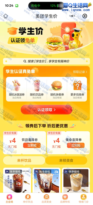 美团学生领4元红包 1.9元喝库迪咖啡等