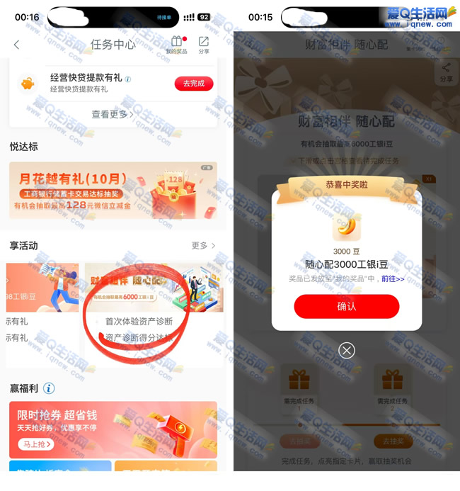 工行财富相伴随心配抽奖 亲测3000个i豆