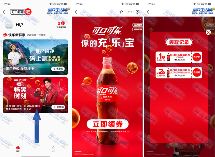 支付宝搜【可口可乐吧】-进去点【畅爽时刻】领券