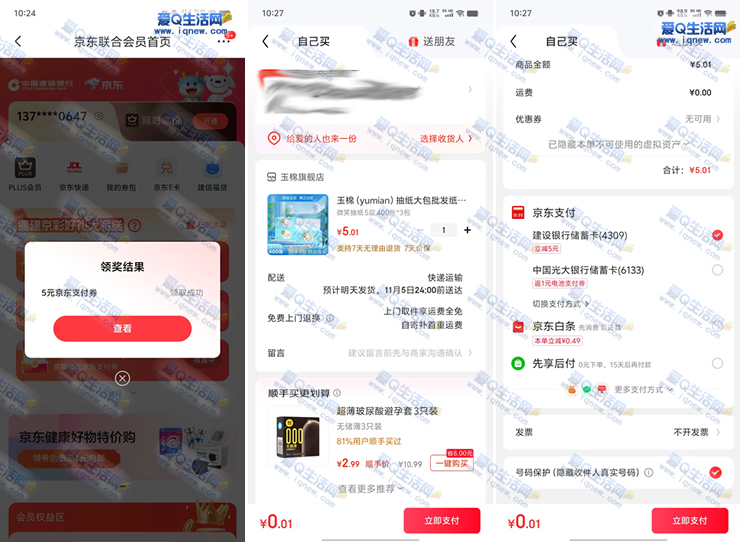 亲测0.01元撸3包抽纸 京东建行联合会员