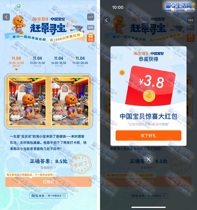 淘宝APP搜【淘个中国宝贝】10点场-答案选B-11月4号全部答案B A B B