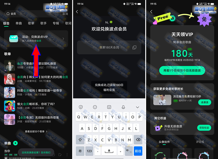 波点音乐APP-搜索【会员】-兑换码输入【我要180天会员】领取秒到