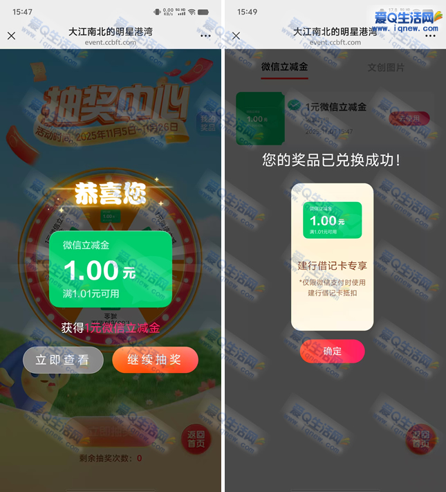 亲测1元立减金秒到 建行大江南北的明星港湾抽奖