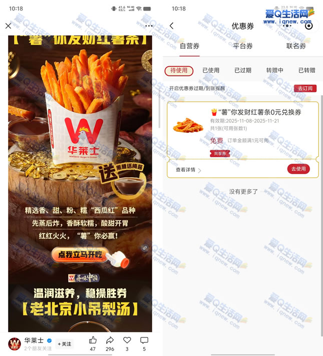 华莱士领0元薯条 随单消费先到先得