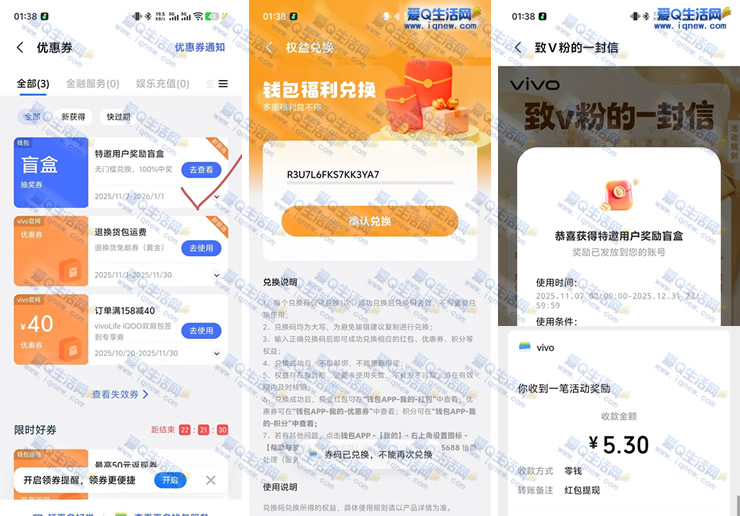 vivo旗下手机-打开钱包APP-我的-优惠券-特邀用户奖励盲盒-去兑换领取奖励试试