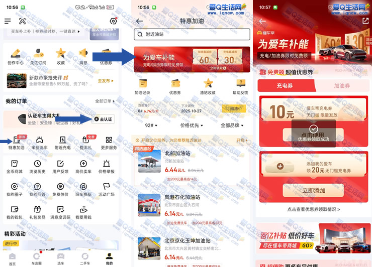 1.懂车帝APP-我的-下拉至【特惠加油】横幅【为爱车补能】进去可领10+20电车充电卷