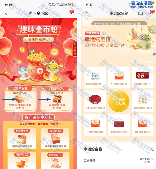 招行趣味金币蛇抽奖 抽鼠标垫/抽纸/雨伞实物