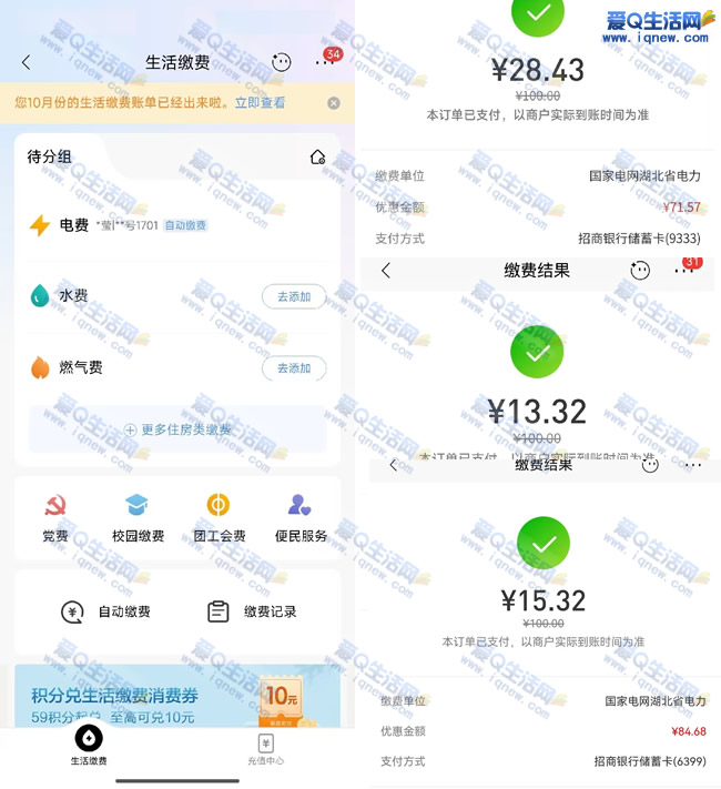 湖北招行卡试试 缴费10-100元都有随机立减 一次机会