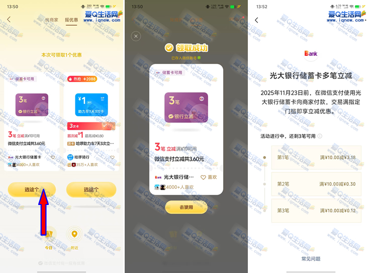 微信搜【微信支付】-右下角【摇优惠】-有光大3.6元立减金/哈啰助力车立减 二选一