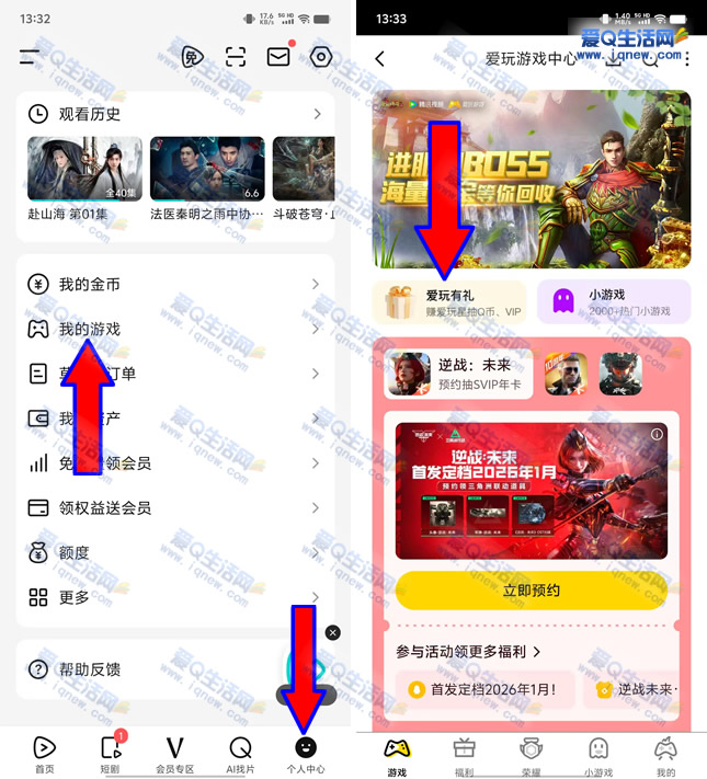 腾讯视频APP-底部【个人中心】-下拉【我的游戏】-【爱玩有礼】